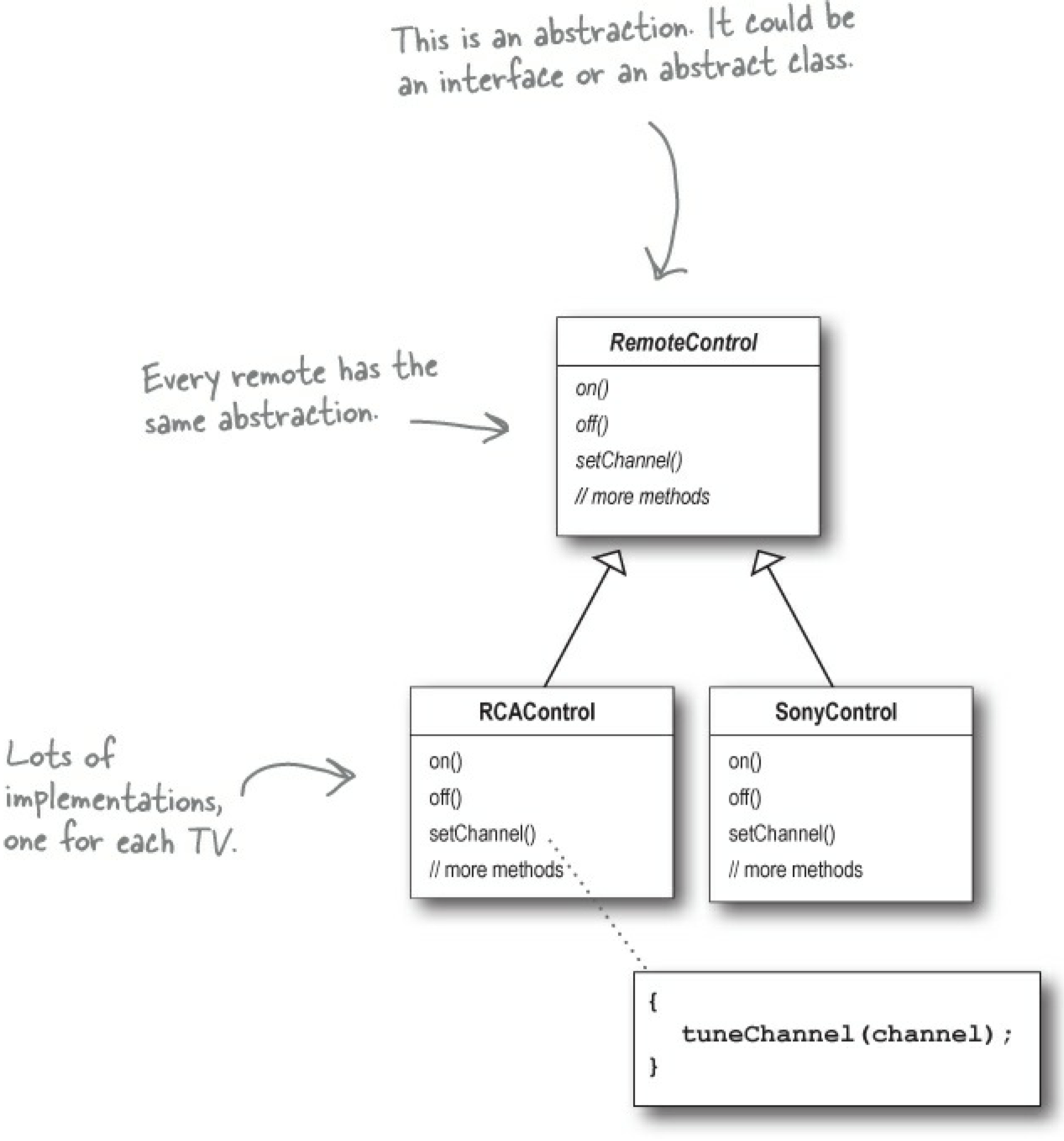 하지만, 문제는 리모컨의 기능과 TV 모델들이 바뀔 수 있다는 점이다. 여러 TV에서 구현을 다양화할 수 있도록 리모컨은 이미 추상화했지만, 리모컨의 기능이 개선될때마다 TV 모델들의 구현 또한 변경되어야 할 수 있다.