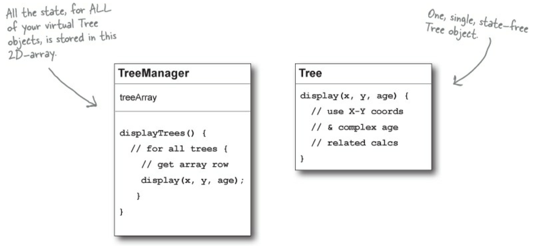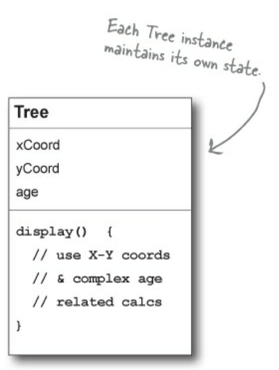 이러한 경우 수천 개의 Tree 오브젝트가있는 대신 Tree 인스턴스는 하나만 존재하고, 모든 트리의 상태를 유지하는 클라이언트 오브젝트가 있도록 시스템을 설계 하는 것이 바로 Flyweight 패턴이다.