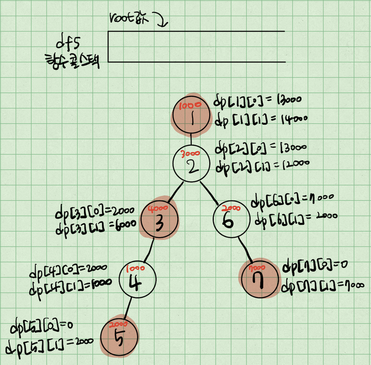 dp[i][0]: i번 마을이 우수 마을이 아니었을 때 i번 마을을 루트로 하는 서브 트리의 우수 마을들 인구수의 최댓값