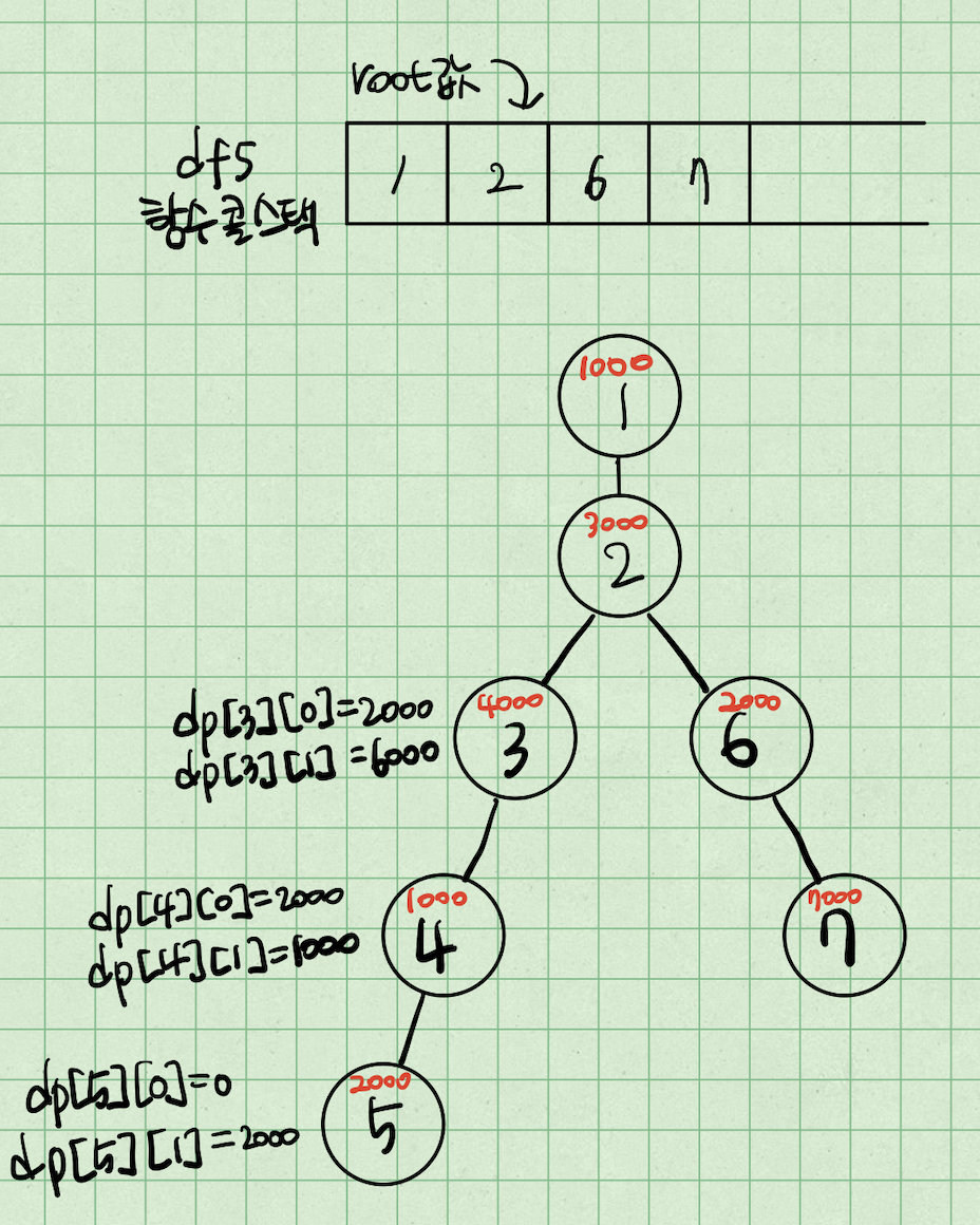 노드 5와 같이 다시 거슬러 올라오면서 dp값을 채우도록 한다.