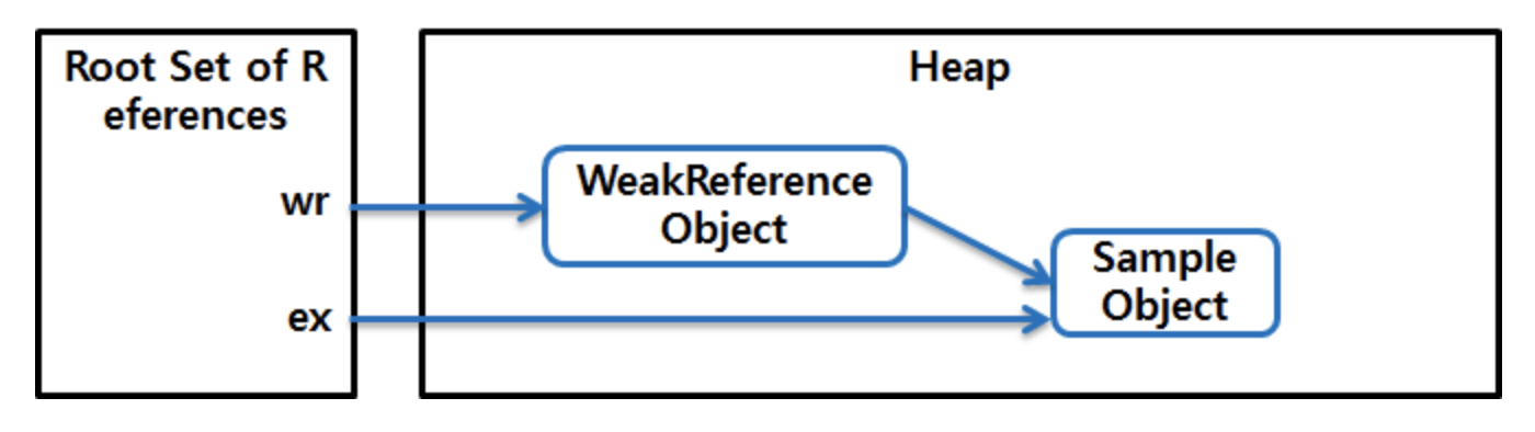 위 그림에서 WeakReference 객체 자체는 weakly reachable 객체가 아니라 strongly reachable 객체이다. 또한, 그림에서 A로 표시한 객체와 같이 WeakReference에 의해 참조되고 있으면서 동시에 root set에서 시작한 참조 사슬에 포함되어 있는 경우에는 weakly reachable 객체가 아니라 strongly reachable 객체이다.
