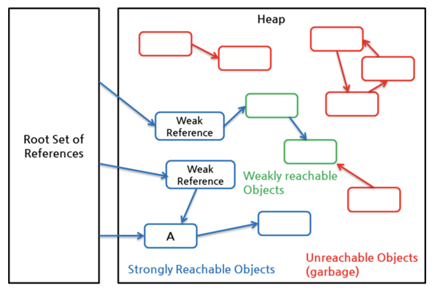 녹색으로 표시한 중간의 두 객체는 WeakReference로만 참조된 weakly reachable 객체이고, 파란색 객체는 strongly reachable 객체이다. GC가 동작할 때, unreachable 객체뿐만 아니라 weakly reachable 객체도 가비지 객체로 간주되어 메모리에서 회수된다.