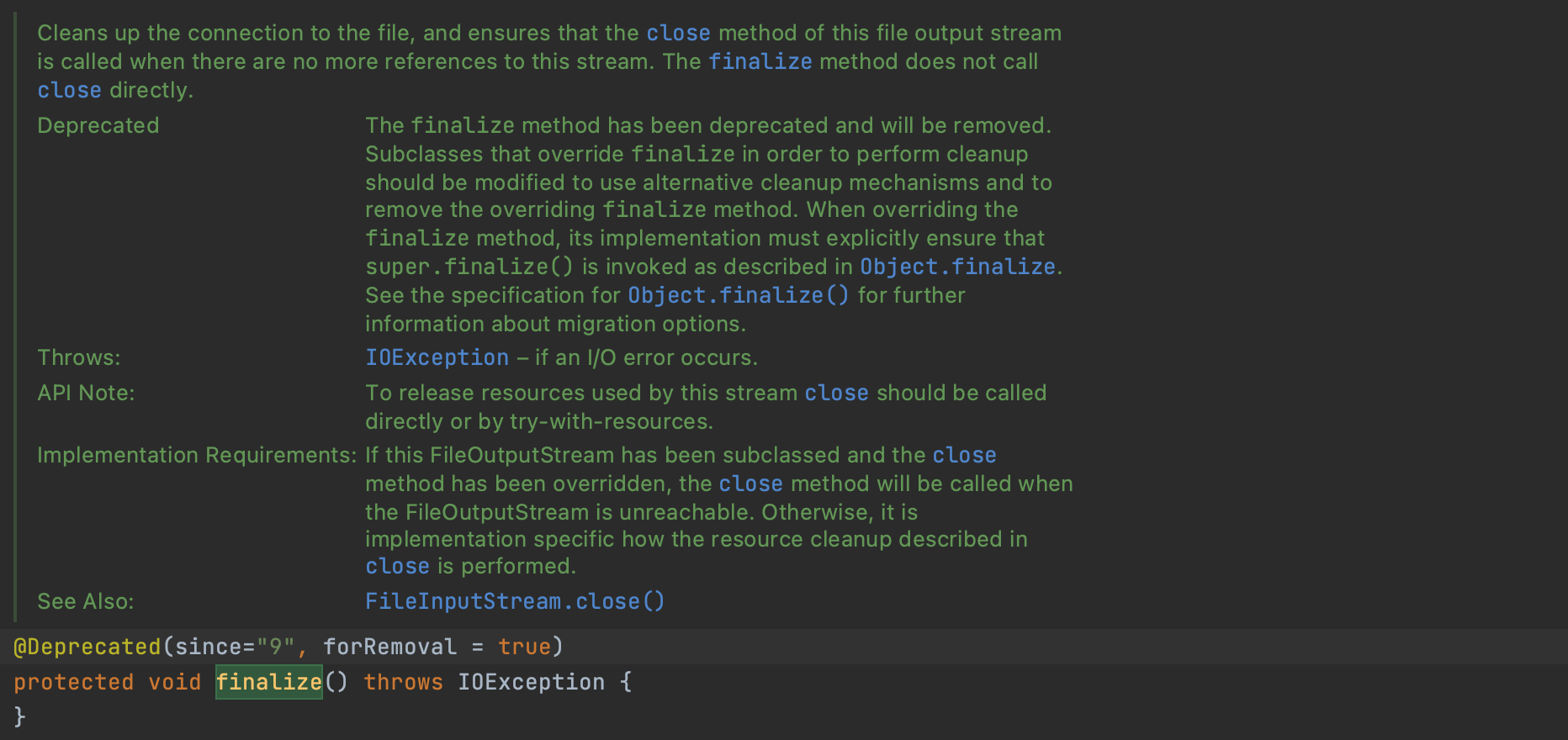 - FileInputStream & FileOutputStream: Ensures that the `close` method of this file stream is called when there are no more references to it.