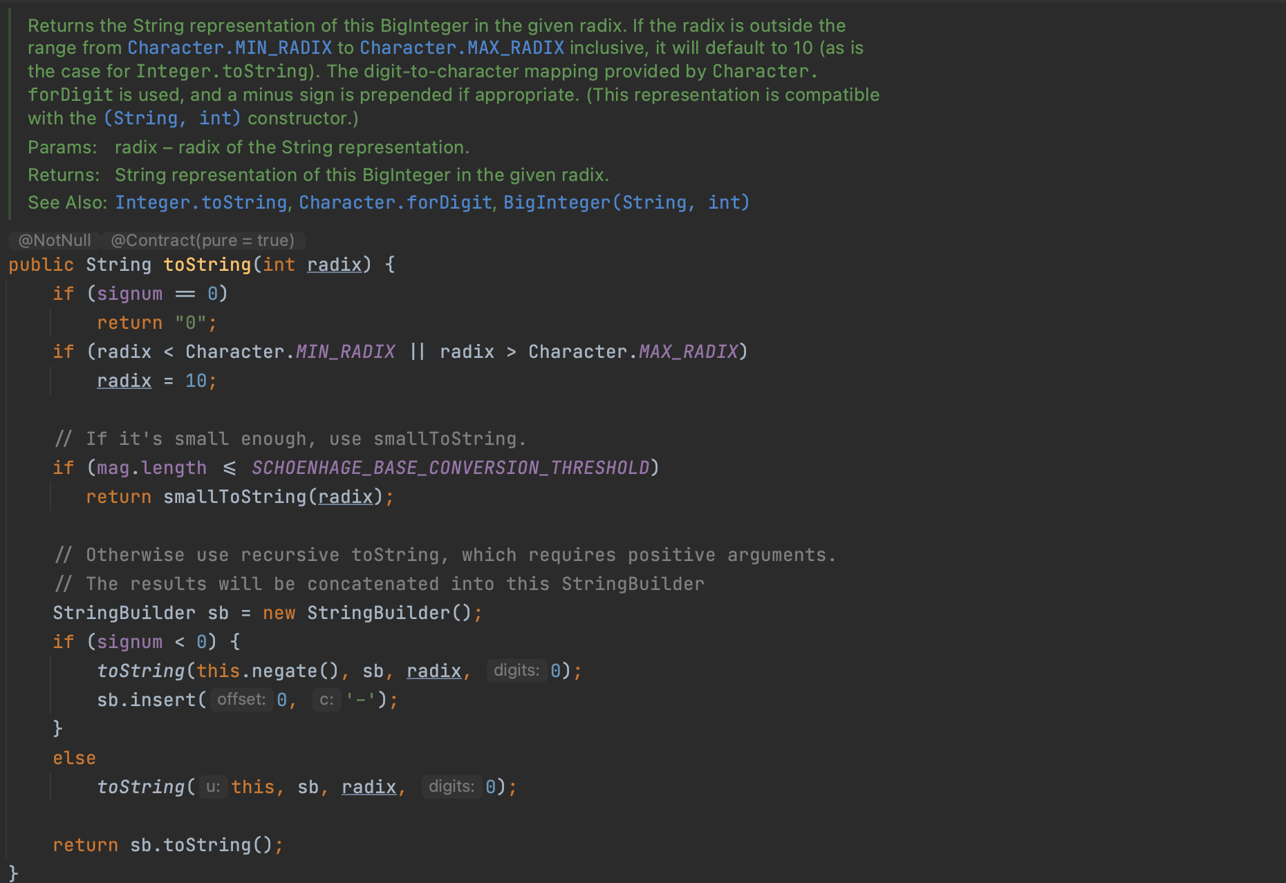 toString 메서드는 객체를 println, printf, 문자열 연결 연산자(+), assert 구문에 넘길 때, 혹은 디버거가 객체를 출력할 때 자동으로 불린다.
