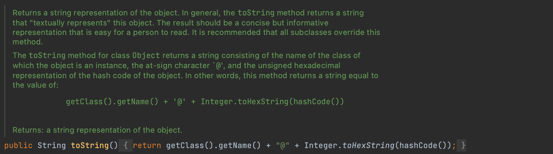 Object의 기본 toString 메서드는 단순히 클래스이름@16진수해시코드를 반환한다.