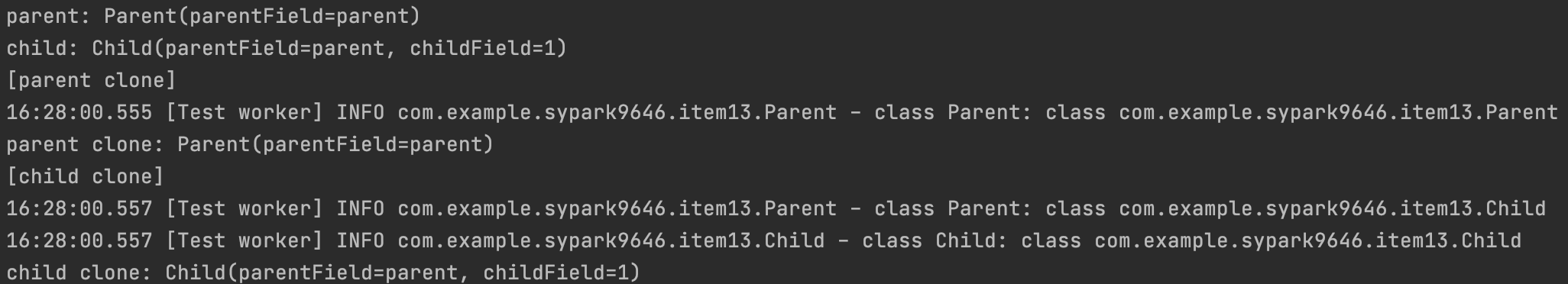 System.out.println("child clone: " + childClone); // child: Child(parentField=parent, childField=1)