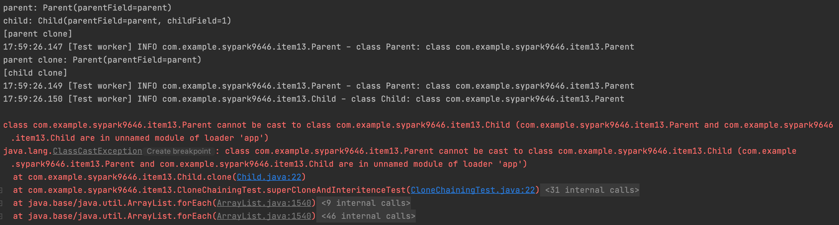 요 부분만 바꿨을 뿐인데, Child clone에서는 parent 클래스의 다운캐스팅이 일어나게 되고, 이 부분에서 런타임 에러가 발생하게 되는 것..