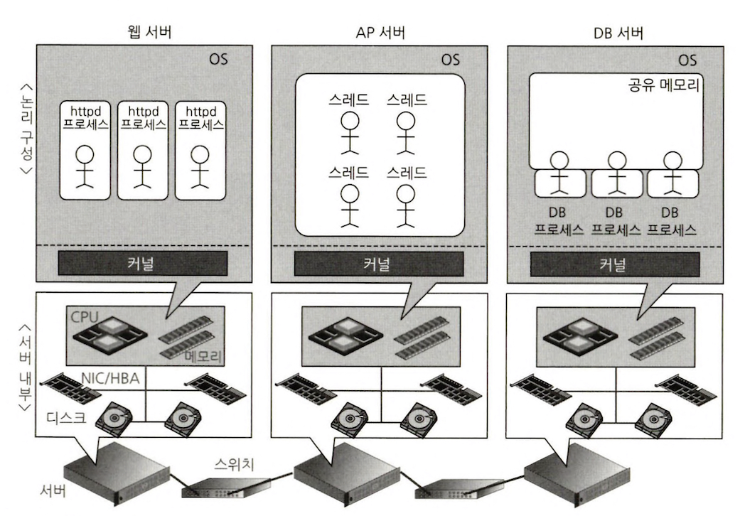 - 버스: 서버 내부 컴포넌트들을 연결시키는 회선으로, 전송능력(대역: 전송폭+전송횟수 = throughput)이 중요하다.