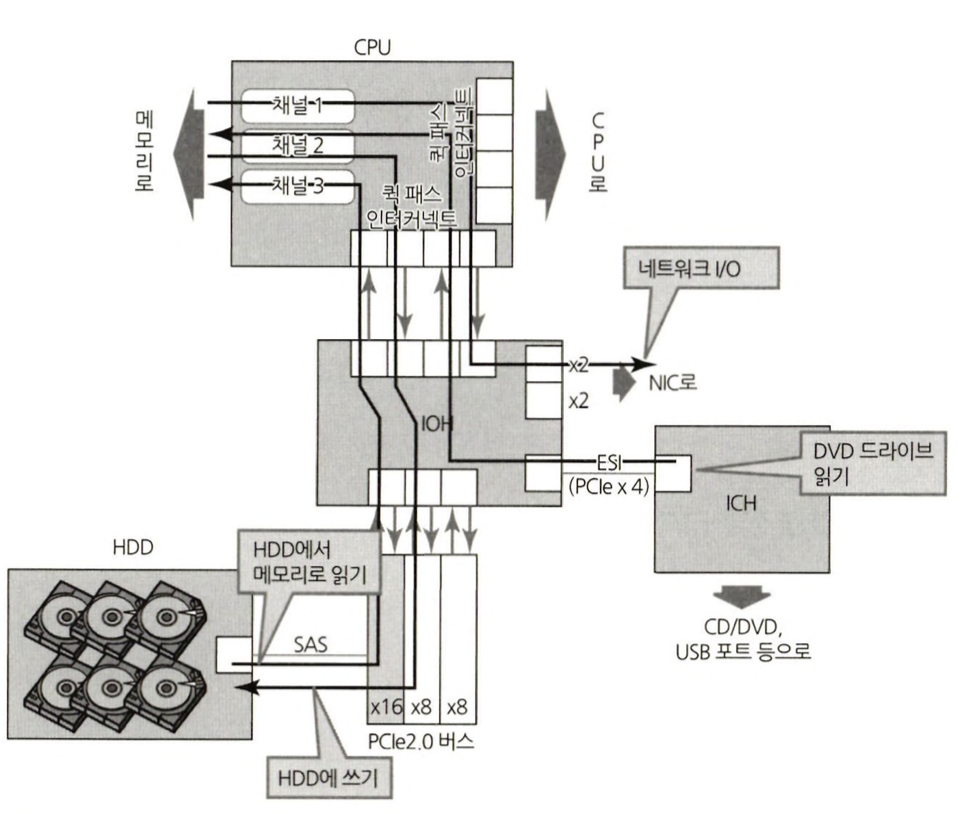 - IOH(IO 핸들러): 이전에는 메모리 IO가 주 역할이었지만, CPU에 그 역할이 옮겨간 후, 고속 처리가 필요한 PCI Express나 네트워크 IO를 제어한다. 또는 CPU간 데이터 전송 제어를 하기도 한다.