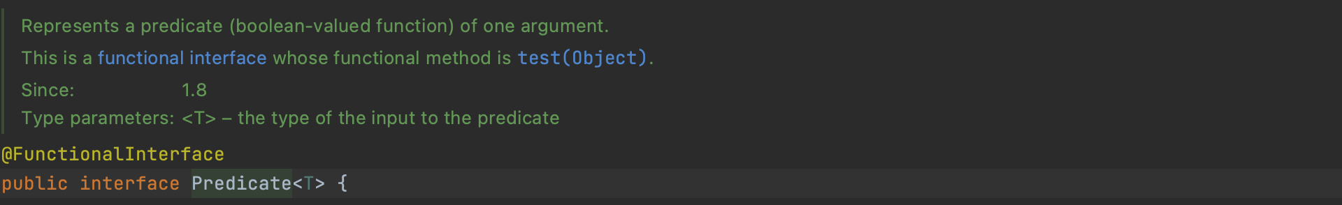 위에서 알아봤듯이 함수형 인터페이스는 정확히 하나의 추상 메서드를 지정하는 인터페이스이다. Predicate 인터페이스를 보면 알 수 있듯이, 함수형 인터페이스에서도 디폴트 메서드를 포함할 수 있다. 즉, 디폴트 메서드가 있더라도 추상 메서드가 오직 하나이면 함수형 인터페이스이다.