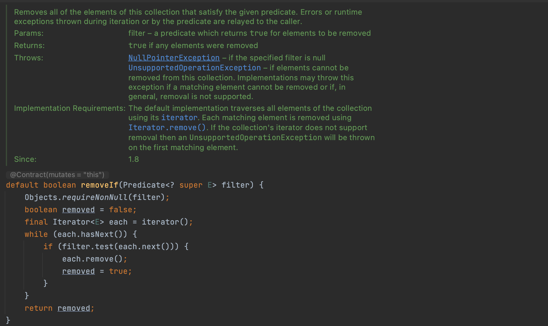 자바 8의 Collection 인터페이스에 추가된 removelf 디폴트 메서드를 보자.