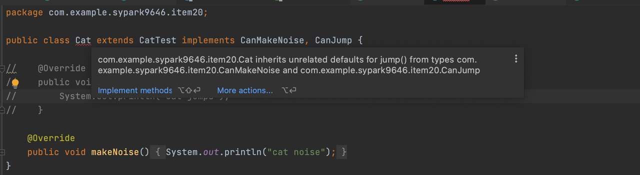 - 그 다음으로는 여러 인터페이스를 상속받는 클래스가 명시적으로 디폴트 메서드를 오버라이드 하고 호출해야 함. => 아이템 20에서 봤던 것 처럼 명시적으로!