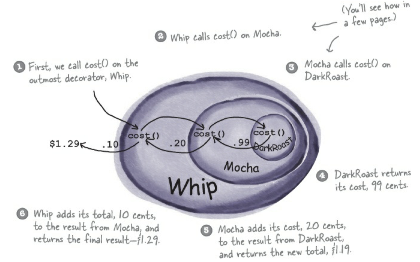 - 한 객체를 여러 개의 데코레이터로 감쌀 수 있는데, 이때 decorator 의 super class 는 자신이 감싸고 있는 객체의 super class 와 같다 => 따라서 싸여져 있는 객체(ex. darkroast) 대신 다른 프록시를 넣어도 됨