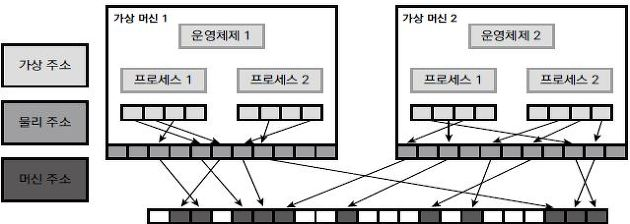 가상화 환경에서 메모리 주소 체계를 살펴보면, 그림과 같이 가상주소, 물리주소, 머신 주소라는 세 단계를 가진다.