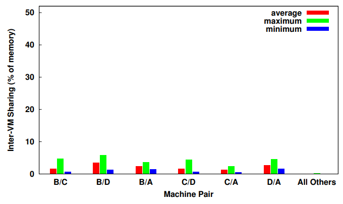inter-VM sharing의 평균값은 약 2%로 매우 낮으며, 나머지 15개의 페어링에서는 더 낮은 0.1% 의 inter-VM sharing 이 관찰되었다.