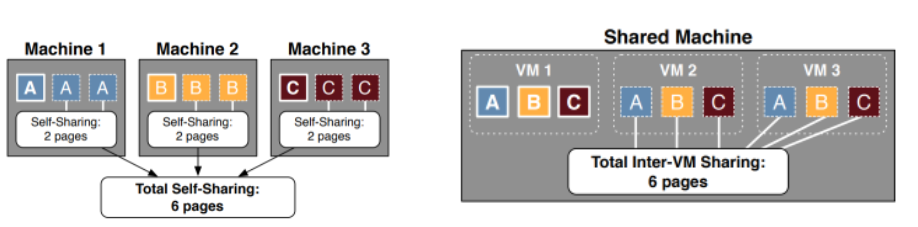 - self-sharing: 개별 VM 내에서 공유하는 방식이며, 왼쪽 그림 예시를 보면 machine 당 A, B, C 3 copy 씩 존재하므로 6개의 중복 페이지들을 절약할 수 있다.