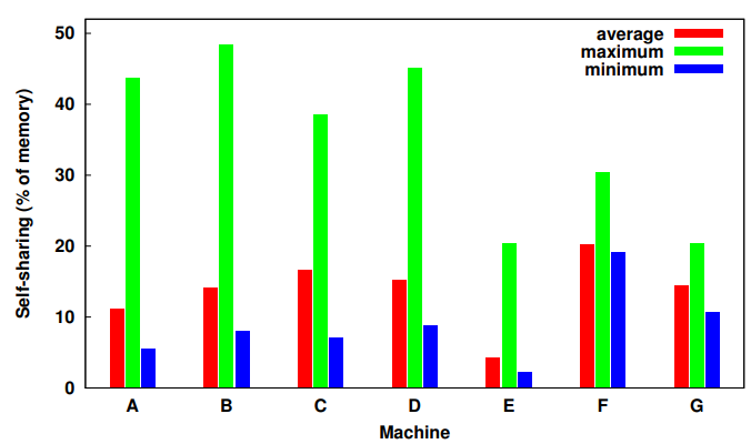 먼저 실제 메모리 트레이스의 sharing 경향을 보기 위해 일주일동안 30분마다 수집한 트레이스의 self-sharing 에 대한 최대값, 최소값, 그리고 평균값에 대해 집계한 그래프를 보면 (E는 굉장히 특이한 경우이므로 제외하고 해석)