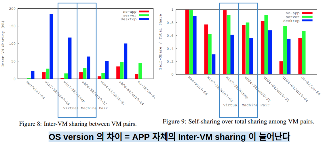 두번째 알 수 있는 점은 공통 major 플랫폼의 다른 버전을 함께 사용하면 no-app(기본 시스템)에서 inter-vm sharing 이 매우 작은 값이지만, 공통 응용 프로그램의 경우 inter-vm sharing 의 비율이 증가됨을 관찰 할 수 있다.