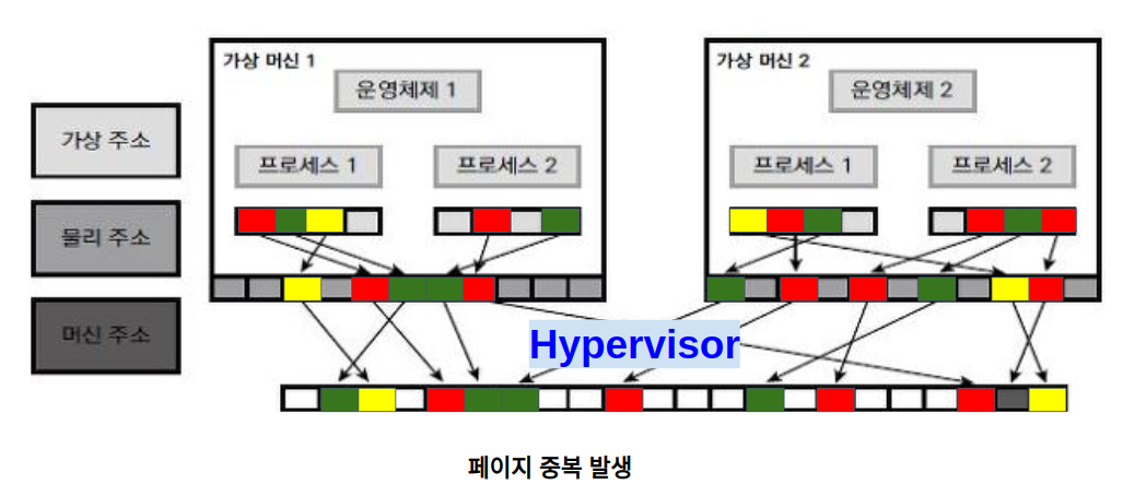 가상 머신에서 동작하는 게스트 운영체제는 가상화 환경에서 동작한다는 사실을 모르는 상태이며, 하이퍼바이저의 중재 아래 실제 물리 주소로 변환해서 사용된다.