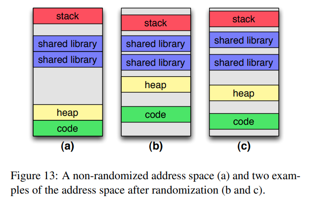 이 기술은 공격자가 알려진 주소를 사용하는 것을 방지하기 위해 설계되었으며, 그림 13a에 표시된 주소 공간의 예에 대해 두 가지 가능한 무작위화가 그림 13b 및 13c에 나와 있다.