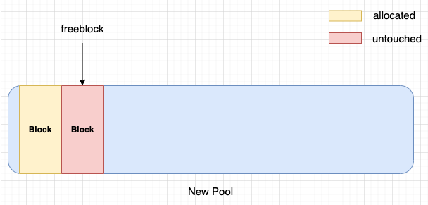 대신 가장 낮은 주소를 가지는, 처음 두개 블록만 설정되어 첫 번째 블록을 반환하고, pool->freeblock 을 두 번째 블록을 포함하는 단일 블록 리스트로 설정한다. 이는 pymalloc 이 실제로 필요할 때까지 메모리 조각을 건드리지 않으려고 아레나, 풀 및 블록 등 모든 수준에서 노력하는 것이다.
