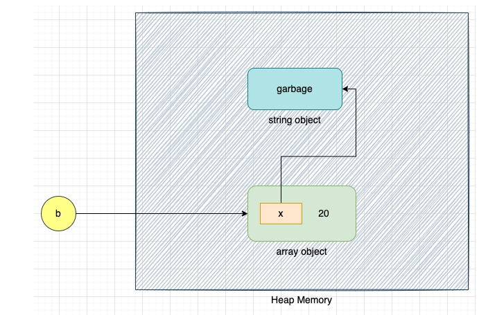 문자열 객체 "garbage" 의 참조 횟수는 아래와 같이 배열 객체 [x, 20]로 인해 1이 된다.