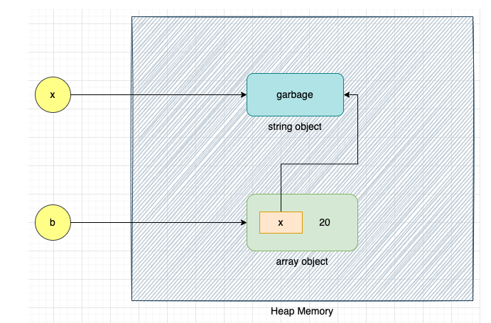 배열 객체 [x, 20] 를 삭제하면 배열 객체에서 문자열 객체 "garbage" 의 참조 x 도 삭제된다.