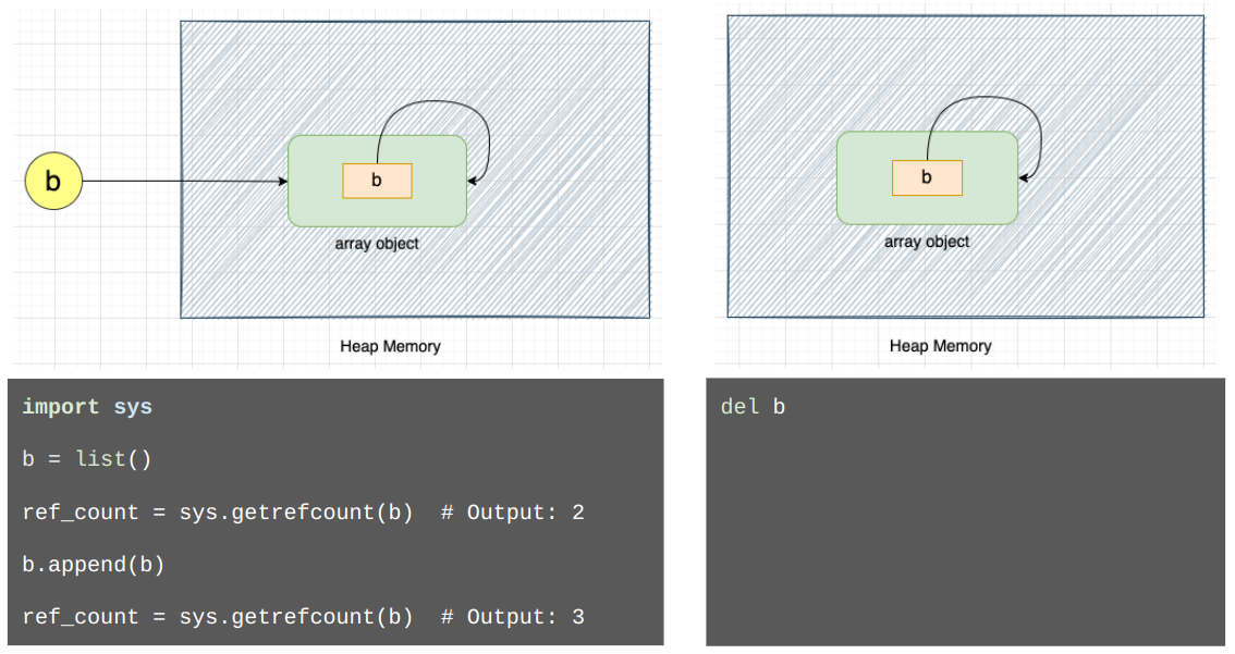 오른쪽처럼 참조 b 를 삭제하면 Python 코드에서 배열 객체에는 접근할 수 없지만, 오른쪽 이미지와 같이 메모리에는 계속 존재하게 된다. 배열 객체가 자기 자신을 참조하므로 배열 객체의 참조 횟수는 영원히 0이 되지 않으며, 참조 횟수 기반 가비지 컬렉션에 의해서는 수집될 수 없다.