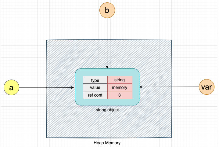 이 상황에서 동일한 문자열 객체 메모리를 가리키는 또 다른 변수 b 를 생성해 보자: