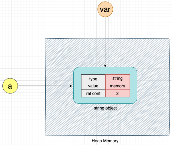 필드 ref count 는 객체에 대한 참조 횟수를 나타낸다. 이전 글에서 우리는 Python 변수가 객체에 대한 참조일 뿐이라는 것을 알고 있다. 위 예에서 변수 a 는 문자열 객체 메모리에 대한 유일한 참조이다. 따라서 문자열 객체 메모리의 참조 카운트 값은 1이다.