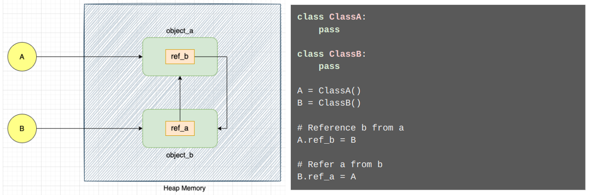 각각 ClassA 및 ClassB 클래스의 두 객체 object_a 및 object_b를 정의한다고 하자. object_a 는 변수 A 에서 참조하고 object_b 는 변수 B에서 참조 할 때, object_a 에는 object_b 를 가리키는 속성 ref_b 가 있다. 마찬가지로 객체 object_b 에는 object_a 를 가리키는 속성 ref_a 가 있다. 즉, object_a 와 object_b 는 각각 변수 A 와 B 를 이용하여 Python 코드에서 접근 할 수 있다.