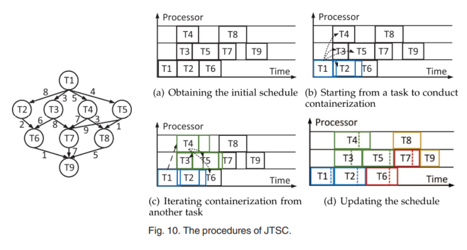 - idle time: 병렬 컴퓨팅에서는 1) 모든 상위 작업과 2) 동일한 프로세서에서 예약된 이전 작업이 완료되기 전에는 작업을 시작할 수 없기 때문에, 이 원칙에 따라 프로세서의 idle time이 존재한다. 이 idle time 동안 컨테이너 간 통신이 제대로 수행될 수 있다면 동일한 프로세서에서 후속 작업이 지연되지 않을 수 있다.