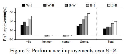 아래 그림은 NUMA 인식 VM 스케줄링 정책의 조합을 보여준다. 각 조합에서 첫 번째 문자는 캐시 정책을 나타내고 두 번째 문자는 NUMA 정책을 나타내는데, W-W 정책에 비해 성능 향상이 일어났음을 확인할 수 있다.