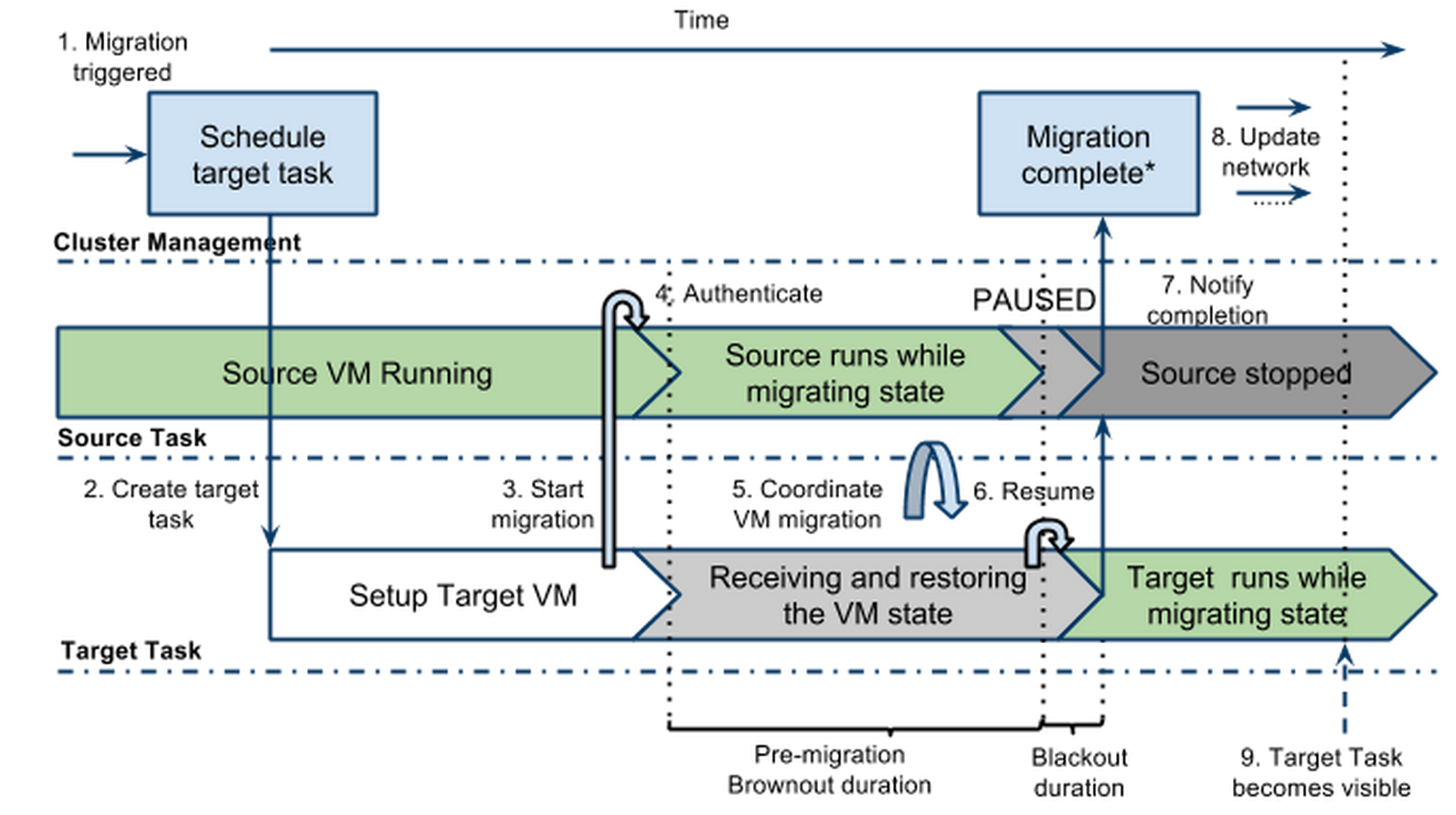 - 브라운 아웃 기간: 새로운 VM이 가동된 상태로, 메모리 상의 데이터 등의 VM 내용을 새로운 VM에 복사