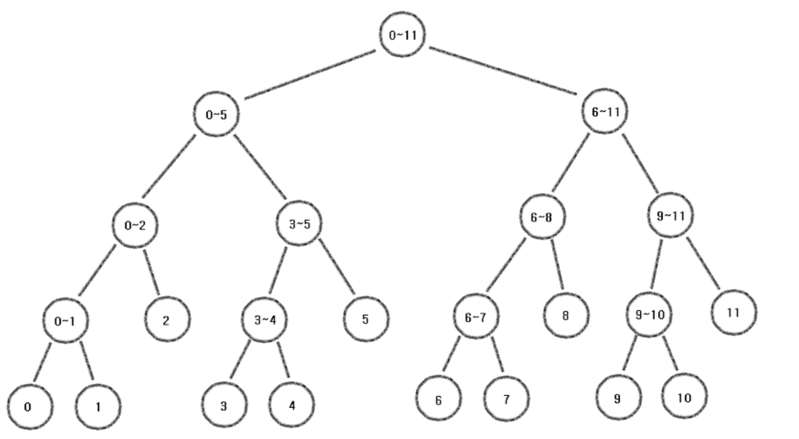 - 각 노드에 저장되는 값은 3가지이다 --> 저장되는 칸의 번호, 구간 시작, 구간 끝 (구간시작==구간끝: 리프 노드)