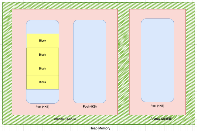 작은 객체가 메모리를 요청하되, 이 요청을 처리할 기존 영역이 없는 경우 raw memory allocator 는 운영 체제에서 큰 메모리 블록 256KB 를 요청한다. 이러한 큰 메모리 블록을 아레나라고 한다. (그리고 풀은 필요할 때 아레나에서 만들어진다.)