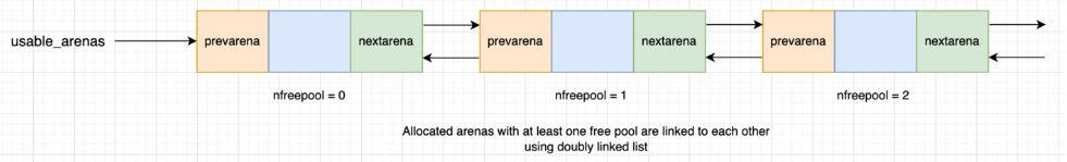 useable_arenas: CPython 은 사용 가능한(empty 또는 used 상태) 풀이 있는 모든 아레나를 추적하기 위해 useable_arena 라는 이중 연결 리스트를 유지 및 관리한다. useable_arenas 리스트는 nfreepools 값의 오름차순으로 정렬된다.