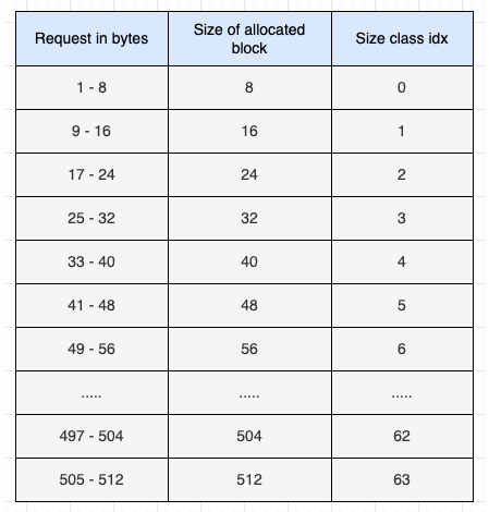 블록은 다양한 크기로 제공된다. 블록의 최소 크기는 8 byte 이고, 최대 크기는 512 byte 이다. 블록 크기는 8의 배수로 8, 16, 24, 32, ..., 504, 512 바이트가 될 수 있다. 각 블록 크기를 Size Class 라고 한다. Size Class 는 아래와 같이 64 개의 등급으로 나뉜다.