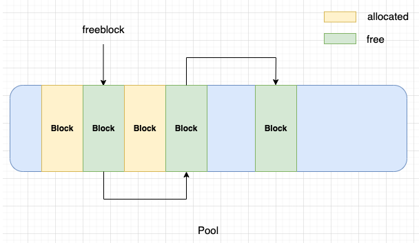 freeblock: 풀 내에서 사용가능한 블록의 단일 연결 리스트의 시작을 가리키는 포인터로, 할당된 블록이 해제되면 freeblock 포인터 앞에 추가된다.